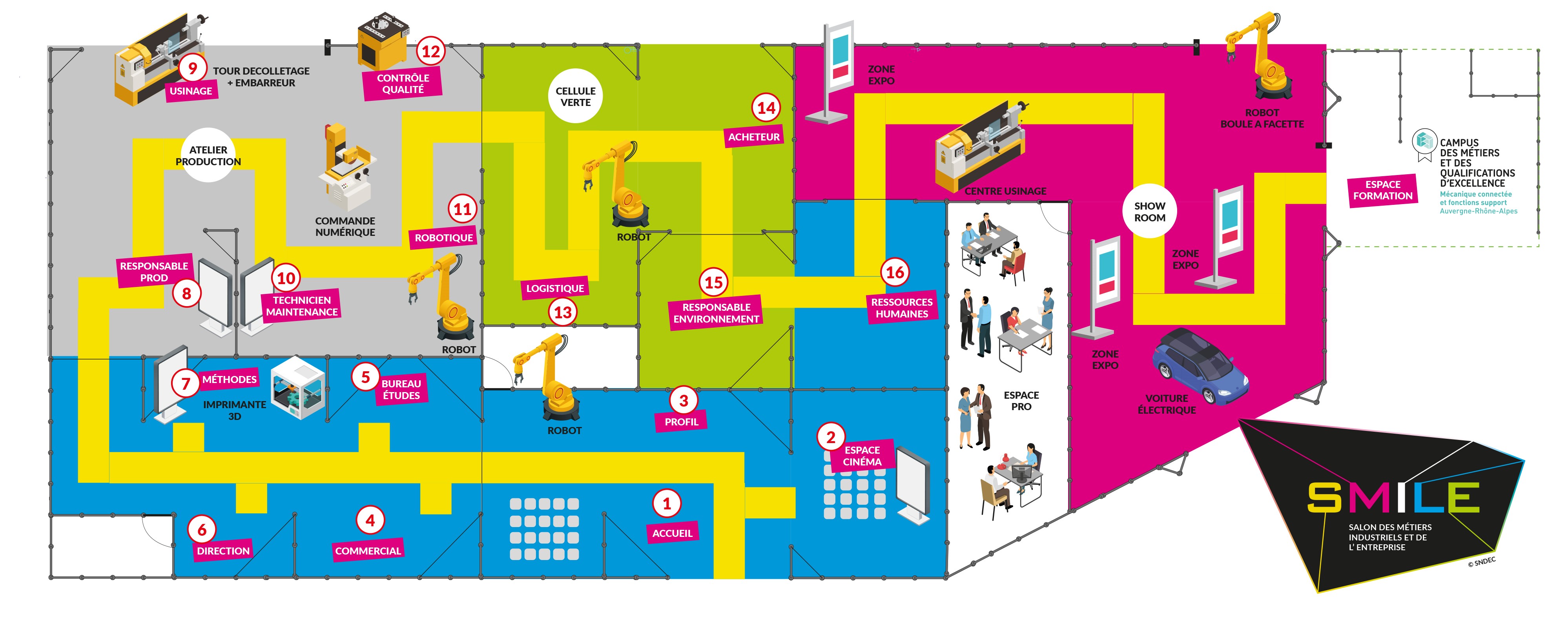 Ouvre grands tes yeux car dès l’accueil, l’univers de l’industrie t’ouvre ses portes. Tu vas visiter une entreprise industrielle reconstituée et découvrir 13 espaces métiers. Tu seras accompagné par un jeune technico-commercial qui à l’aide de sa tablette te guidera tout au long de la visite.